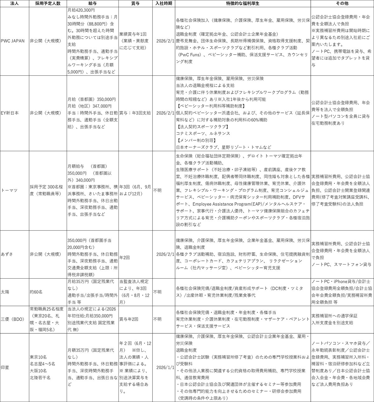 4大&準大手監査法人の募集要項比較